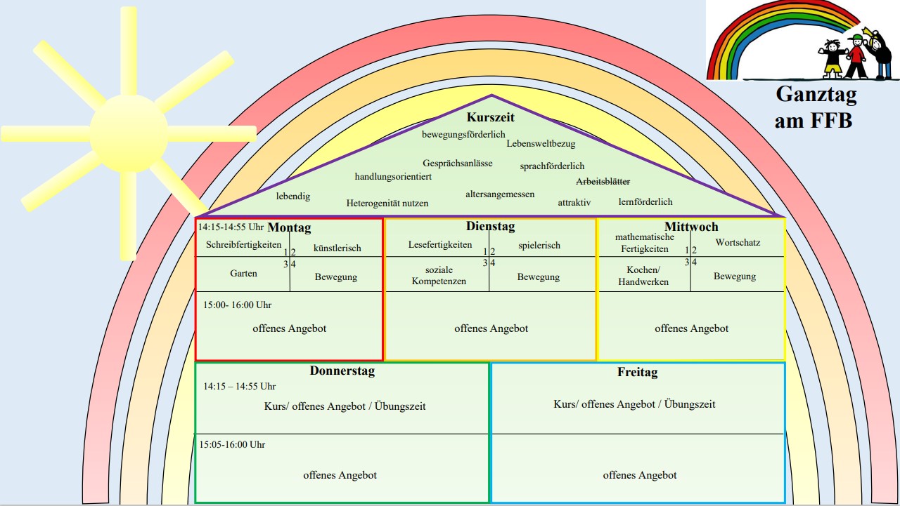 Als offene GTS gliedert sich die Tagesstruktur unserer Schule klassisch in Unterricht von 8:00 bis 13:00 Uhr und in die Nachmittagsbetreuung von 13:00 bis 16:00. Hier haben die Kinder nach einer Pause sowie einem Mittagessen die Möglichkeit in einer festen Kurszeit aus verschiedenen spannenden Angeboten zu wählen. Später soll auch noch genug Zeit bleiben, um nach einem anstrengenden Schultag mit Freunden zu spielen. Zu unseren Angeboten gehören beispielsweise, Fußballkurs, Basketball, Kreatives Gestalten, Psychomotorik, Yoga, Tanzen uvm.