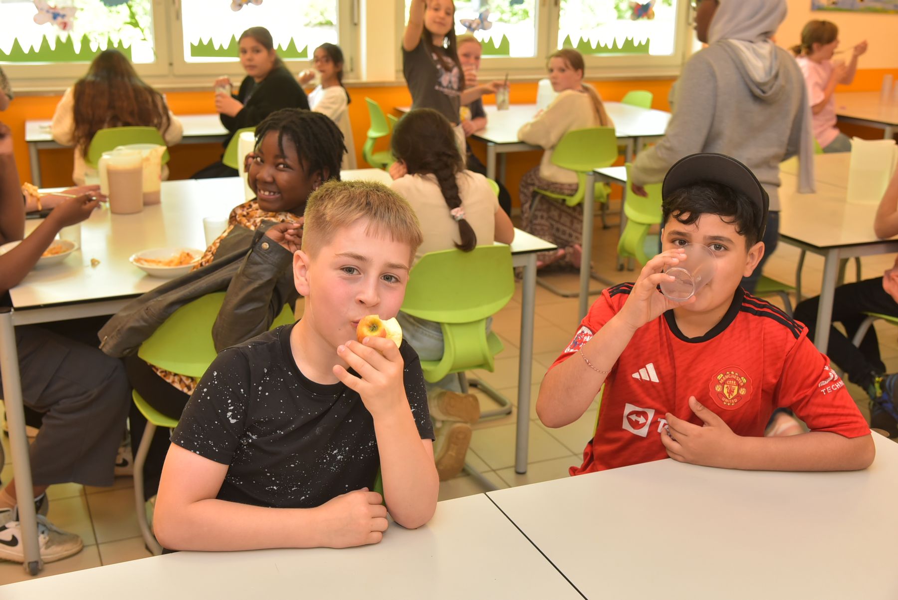 Nach dem Unterricht in der Zeit von 13 bis 14 Uhr haben unsere Kinder die Möglichkeit in unserer großen und freundlichen Mensa ein abwechslungsreiches Mittagessen zu sich zu nehmen. Sie können hier im sogenannten FreeFlow System ihre Portionen und die Zusammensetzung Ihrer Mahlzeit selbst bestimmen. Täglich wird neben dem Hauptgericht stets eine wechselndes Frischeangebot an unserer Salatbar angeboten. Auch unser Mittagessen wird von unseren festen Fachkräften als feste Bezugspersonen begleitet.