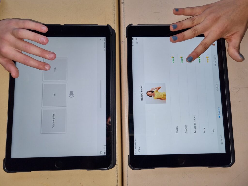 iPads: Jeder Klasse steht in zwei Unterrichtsfächern ein Klassensatz iPads zur Verfügung, an denen die Schülerinnen und Schüler unterrichtsbegleitend arbeiten. Eine fächerumgreifende Lernplattform ist zum Beispiel ANTON.